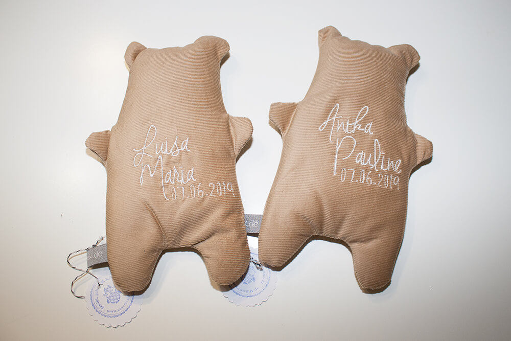 Eine Freundin hat kürzlich Zwillinge bekommen. Für die beiden Mäuschen habe ich gern individuelle Körnerkissen aus Cord-Stoff genäht. Süße Bärchen, oder? Sie sind mit Rapssamen gefüllt und auf die Rückseite habe ich jeweils die Namen und das Geburtsdatum gestickt.