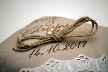 Der 14. Oktober 2017 war für Kristina und Christoph ein ganz besonderer Tag. Sie haben geheiratet und ich habe mich sehr gefreut, das Ringkissen für die Ringübergabe beisteuern zu dürfen. Stoffe und Farben sind im trendigen Vintage-Look gewählt, welches sich durch die gesamte Hochzeitsdeko zieht.
