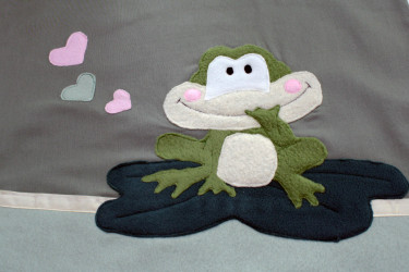 Zum Geburtstag hat Hannah ihren Lieblingsfrosch auf ein Kissen genäht bekommen. Ich hoffe sehr, dass er ihr gefällt und er vor allem die gleiche Wirkung hat, wie ihr eigentlicher Lieblingsfrosch, den sie so sehr mag. In diesem Fall nur ohne Krone: