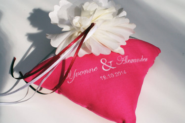 Nach kurzem Brainstorming, welche Farben an der Kleidung der engsten Hochzeitsgesellschaft vorkommen, haben wir uns an die Gestaltung gemacht und für ein pinkes Kissen mit individueller Stickerei der Namen sowie des Hochzeitsdatums entschieden. Kissen aus Samt und Seide gibt es ja schon genug auf der Welt… Kurzerhand hatte die Braut auch eine wunderhübsche Blüte, die ursprünglich eine von vielen an ihrem Brautkleid war, zur Verfügung gestellt.